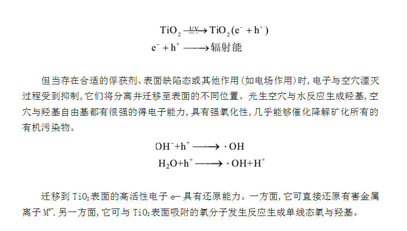 近年來,利用寬禁帶n型半導(dǎo)體制備染料敏化太陽能電池和光催化降解有機(jī)物的**氧化技術(shù)引起了人們的極大關(guān)注,并將此技術(shù)應(yīng)用于COD測定中,目前研究較多的有納米ZnO,SnO2和TiO2材料[4]。和前兩者相比,TiO2來源豐富、價格低廉、耐酸堿腐蝕、耐光蝕、化學(xué)穩(wěn)定性好,是一種具有良好應(yīng)用前景的光催化劑。當(dāng)受到能量大于帶隙寬度的紫外光照時,TiO2價帶上的電子受激發(fā)躍遷到導(dǎo)帶,在半導(dǎo)體的導(dǎo)帶和禁帶上分別形成光生電子與空穴對(e−,h+).被激活的電子和空穴可能在TiO2顆粒內(nèi)部或表面重新相遇而發(fā)生湮滅,將能量通過輻射散發(fā)。
