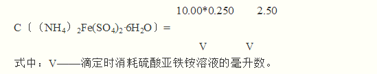 式中:C——硫酸亞鐵銨標(biāo)準(zhǔn)滴定溶液(4.6)的濃度,mol/L;