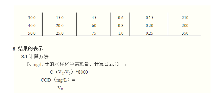 7.1 對于COD值小于50mg/L的水樣,應(yīng)采用低濃度的重鉻酸鉀標(biāo)準(zhǔn)溶液(4.5.2)氧化,加熱回流以后,采用低濃度的硫酸亞鐵銨標(biāo)準(zhǔn)溶液(4.6.4)回滴。