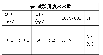 試驗用廢水采用某化工廠排出的綜合廢水,該廢水含有季銨鹽、異丙醇等有機(jī)物,日排放量約為20 m3,COD為18 000~25 000 mg/L,BOD5為7 020~9 750 mg/L,BOD5/COD為0.39左右,屬于可生化真溶液廢水。由于該廢水有機(jī)物濃度高,將其適當(dāng)稀釋后作為試驗用水,其水質(zhì)見表1。
