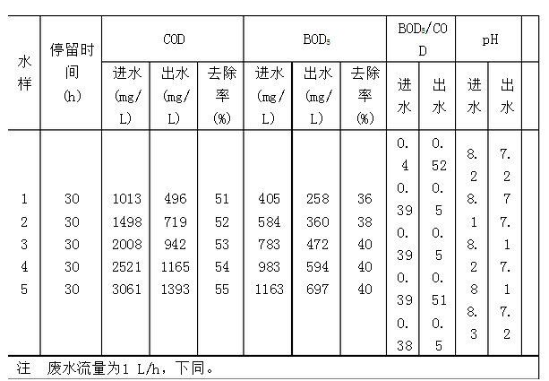 馴化掛膜穩(wěn)定后,在所設(shè)定的工況條件下開始試驗運(yùn)行,定期取樣分析。處理結(jié)果見表2。
