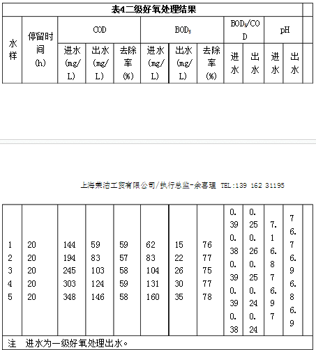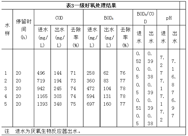 2.2 好氧生物接觸氧化處理 好氧接觸氧化法具有耐沖擊負(fù)荷,無污泥膨脹和維護(hù)方便等優(yōu)點。采用一級好氧生物接觸氧化處理,出水中的COD仍然達(dá)不到排放標(biāo)準(zhǔn),后又增加了一級好氧生物接觸氧化處理(有效容積20 L)。試驗結(jié)果見表3和表4。