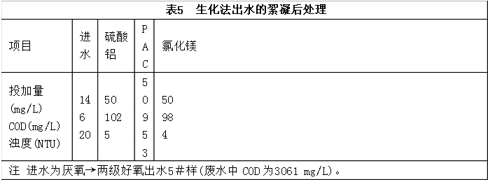 含季銨鹽廢水中COD為2 000~3 000 mg/L,經(jīng)過厭氧→兩級好氧生物接觸氧化處理后,出水COD>100 mg/L,且略有余濁,故進(jìn)行絮凝后處理。分別采用硫酸鋁、聚合鋁(PAC)和氯化鎂為絮凝劑,石灰為助凝劑,試驗結(jié)果見表5。