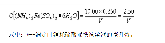 式中:C——硫酸亞鐵銨標準滴定溶液(4.6)的濃度,mo1/L; V1——空白試驗(7.4)所消耗的硫酸亞鐵銨標準滴定溶液的體積,mL; V2——試料測定(7.8)所消耗的硫酸亞鐵銨標準滴定溶液的體積,mL;