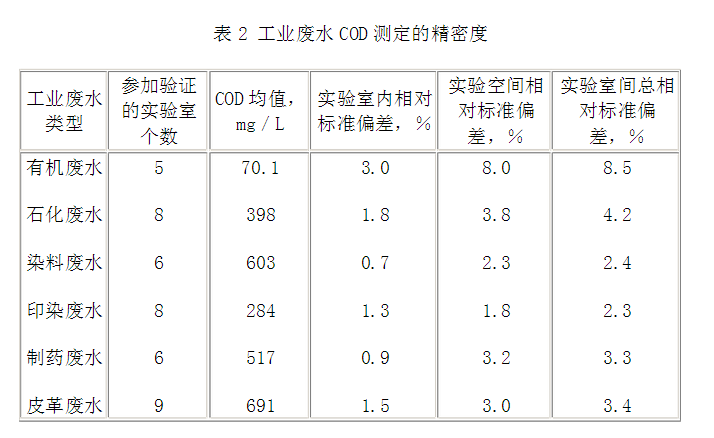 40個不同的實驗室測定COD值為500mg/L的鄰苯二甲酸氫鉀(4.7)標準溶液,其標準偏差為20mg/L,相對標準偏差為4.0%。 8.2.2 工業(yè)廢水測定的精密度(見表2)。