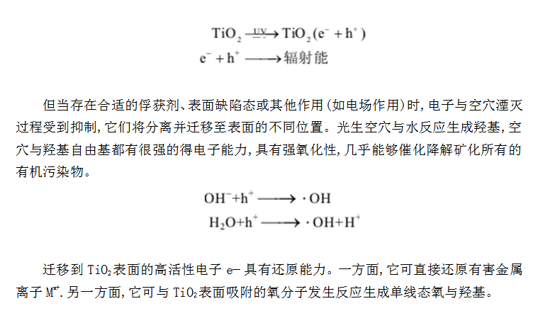 近年來,利用寬禁帶n型半導體制備染料敏化太陽能電池和光催化降解有機物的**氧化技術引起了人們的極大關注,并將此技術應用于COD測定中,目前研究較多的有納米ZnO,SnO2和TiO2材料[4]。和前兩者相比,TiO2來源豐富、價格低廉、耐酸堿腐蝕、耐光蝕、化學穩定性好,是一種具有良好應用前景的光催化劑。當受到能量大于帶隙寬度的紫外光照時,TiO2價帶上的電子受激發躍遷到導帶,在半導體的導帶和禁帶上分別形成光生電子與空穴對(e−,h+).被激活的電子和空穴可能在TiO2顆粒內部或表面重新相遇而發生湮滅,將能量通過輻射散發。