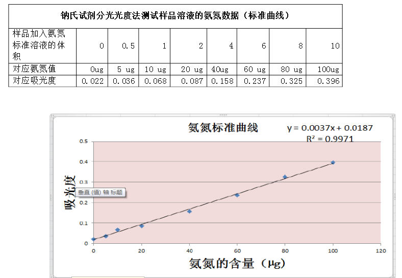 As——水樣的吸光度; Ab——空白試驗的吸光度; a——校準曲線的截距; b——校準曲線的斜率; V——試料體積,ml。結果:水樣氨氮的質量濃度:ρN1=7.4216mg/L、ρN2=7.962mg/L 平均的質量濃度:ρN=7.6918mg/L