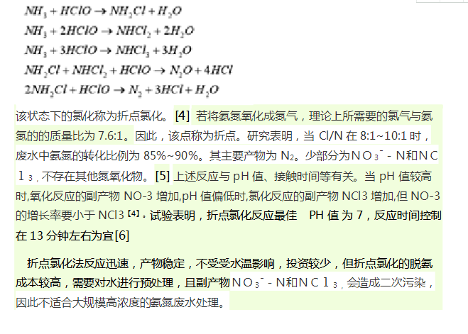折點氯化法(Break Point Chlotination)是將氯氣通入廢水中達到某一點,在該點時水中游離氯含量較低,而氨的濃度趨于零。當氯氣通入量超過該點時,水中的游離氯就會增多。多余的氯氣與水反應生成次氯酸,次氯酸與氨氣反應生成無害的氮氣,其反應式如下