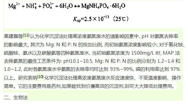 銨離子的某些復鹽(如MgNH4Po4、NINH4Po4、znNH4Po等)不溶于水,化學沉淀法就是利用這些復鹽將氨氮以沉淀的形式除去。MgNH4p04.6H2O(MAP)俗稱鳥糞石(Struivte),工業上由由鎂鹽溶液和磷酸鹽溶液相互作用而得。其反應方程式為: