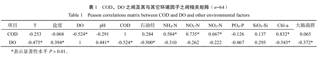 海水中 DO 的主要來源是大氣中氧的溶解,其次來自于海洋生物,尤其是浮游植物光合作用時所放出的氧。表 1 中,DO 值主要與溫度、pH、COD、石油烴、Chl-a、大腸菌群、鹽度等指標顯著相關(guān),相關(guān)系數(shù)分別為-0.475、0.441、-0.524、-0.5、-0.543、-0.372、0.394。DO 與溫度明顯負相關(guān), 符合水體中溶解氧與溫度分布呈反比例的一般規(guī)律(見表 1) 。DO 與 pH 顯著正相關(guān),則反映了有機污染物氧化分解,消耗氧氣,并導致 pH 值下降的過程。DO 與石油烴明顯負相關(guān),可能與石油烴降解耗氧及石油烴污染易在水面形成油膜,影響水-氣界面氧氣交換的作用有關(guān)。盡管亞熱帶河口海區(qū)由于受溫度、光照、及高營養(yǎng)鹽含量等因素影響,往往具有較高的初級生產(chǎn)力(高 Chl-a值) ,浮游植物在光合作用中釋放出大量氧氣,但營養(yǎng)鹽水平較高的海區(qū),其耗氧污染物負荷也較高,污染物降解耗氧速度遠大于生物作用生成氧氣的速度, 這也是 DO 與 Chl-a 呈現(xiàn)負相關(guān)的主要原因。大腸菌群指標常用來表征微生物降解有機物能力,有機污染程度越高,大腸菌群則越高,這也解釋了 DO 與大腸菌群顯著負相關(guān)的主要原因 [21] 。DO 與鹽度顯著正相關(guān),主要為鹽度越高,則越靠近外海,其污染負荷越小,而 DO 含量則越高。